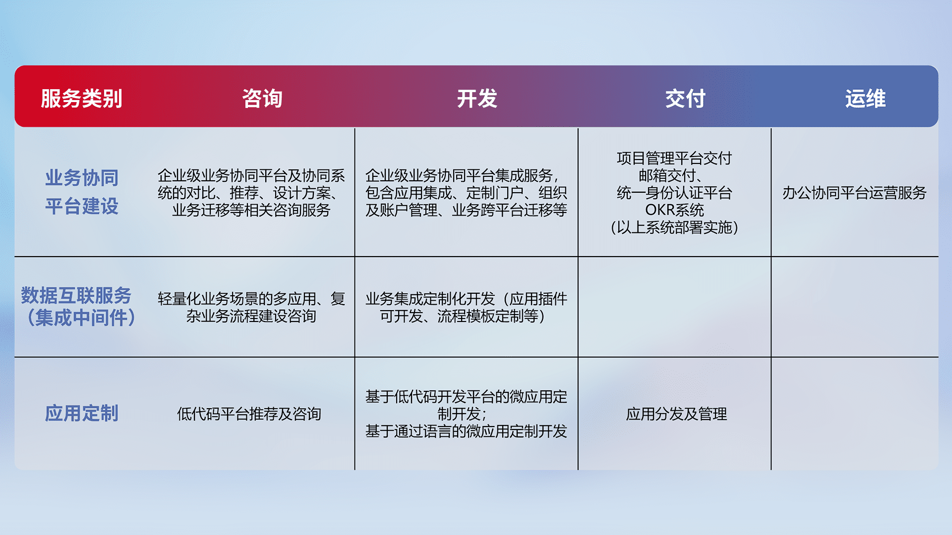 针对钉钉、、企微、、、、IDaas等平台级产品提供产品的规划、、、方案、、、、交付、、、、定制化开发等服务,,实现如统一协同办公、、智能客户服务、、、混合会议管理、、、、智能数据查询、、、、等业务场景,,,实现数字化转型。。